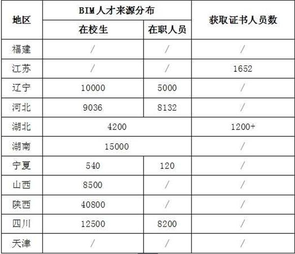 1、來(lái)源分布。11個(gè)省市提供的數(shù)據(jù)表明,BIM人才主要來(lái)源于在校學(xué)生,以及接受BIM相關(guān)培訓(xùn)的企業(yè)在崗人員,詳見表所示。